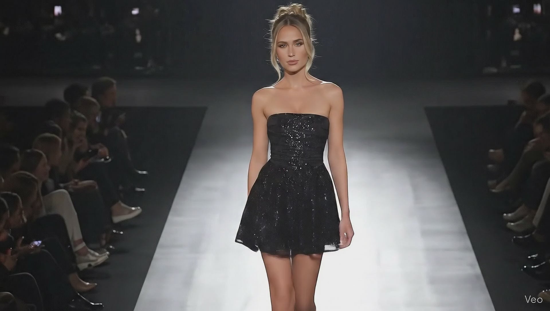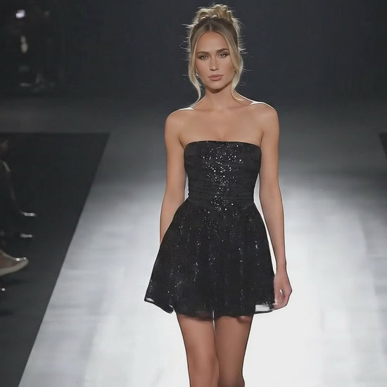 Brilla in ogni occasione con questo abito corto dal design sofisticato e femminile. Il corpetto a fascia mette in risalto le spalle e il décolleté, mentre la gonna ampia in tulle glitterato aggiunge un tocco da vera stella. Il dettaglio con fiocco sul retro dona un finale romantico e seducente.
